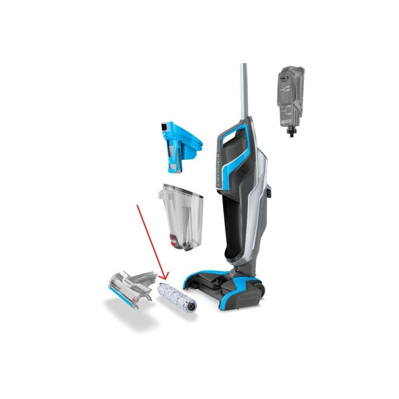 - Soft-touch microfibre brush roll washes messes off hard floors.